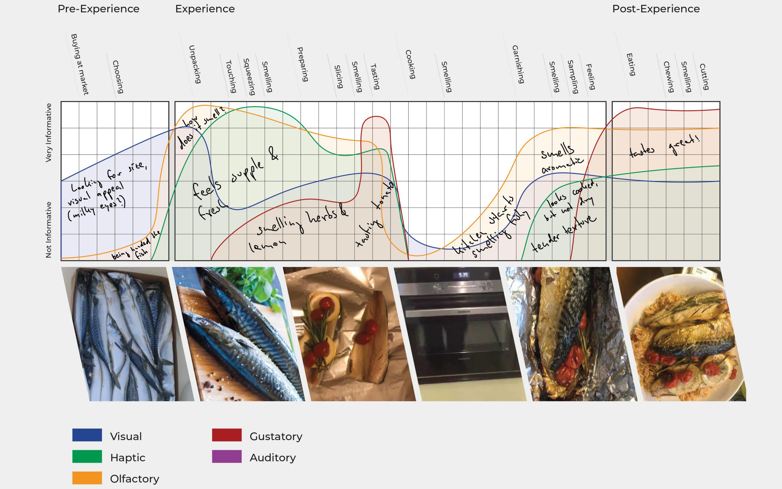 The kitchen space offers ample opportunity to create interface metaphors using sensory stimuli. Through user studies, I identified a relevant scenario to design such sensory metaphors for – situations that can be described as sensory „black boxes.“ These arise whenever appliances (ovens, microwaves, fridges, etc.) get in the way of information being available to the senses. Careless integration of technological innovation can compound the difficulties inherent to these encounters: Technology meant to simplify users‘ lives but experienced through context agnostic interfaces further deepens the sense of overwhelm and intimidation.